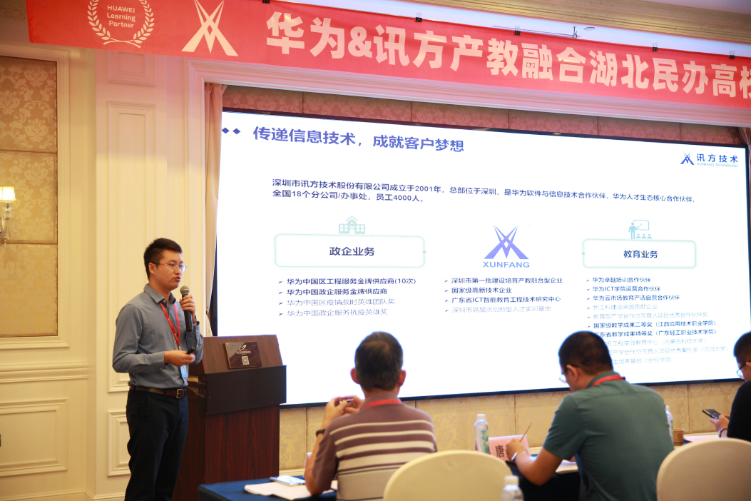 华为湖北省华为云业务总经理-张斌随后致辞。张总代表华为公司向前来参会的各位领导、专家、来宾们表示了热烈欢迎,为能和大家齐聚美丽的温泉之城咸宁,共同探讨“产教融合、协同育人”深化产教融合,促进民办高校教育链、人才链与产业链、创新链有机衔接,开展战略深为期待!张总表示,华为作为全球领先的ICT基础设施和智能终端给予商,致力于把数字世界带入每个人、每个家庭、每个组织,构建万物互联的智能世界,同时华为更是非常重视与高校协同育人,致力于应用型人才的培养。未来我们将结合领先的技术、产品、解决方案及行业数字化转型的案例,联合九州酷游 ku游这样的优秀伙伴一起,整合上下游产业资源,持续助力人才培养大计。
