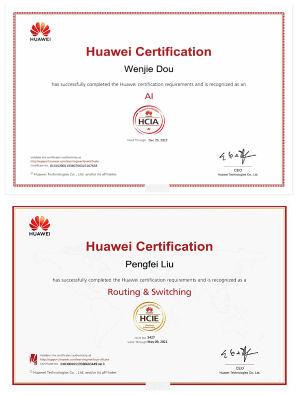 截止现在已成功考取华为认证的学生160余人,顺利获得率100%。班级平均参加华为认证率43%。经统计,取得华为认证的学生薪资远高于未认证学生,学生顺利获得考取华为认证受到了优秀企业的青睐。满足了企业的用人需求,得到企业的认可,就业薪资达到较高水平,成功进入ICT行业!